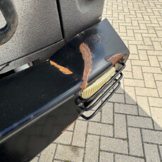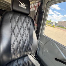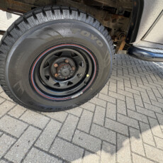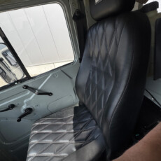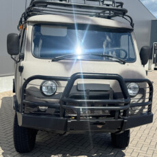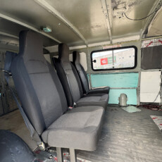 De bus is verhoogd, voorzien van een stevig roofrack, leren stoelen voorin, een ‘bakkie’ en zelfs een autoradio aan het plafond. Hij is stoer gespoten met raptor paint, een coating die speciaal ontwikkeld is om oppervlakten extreem goed te beschermen tegen krassen, roest en weersinvloeden.