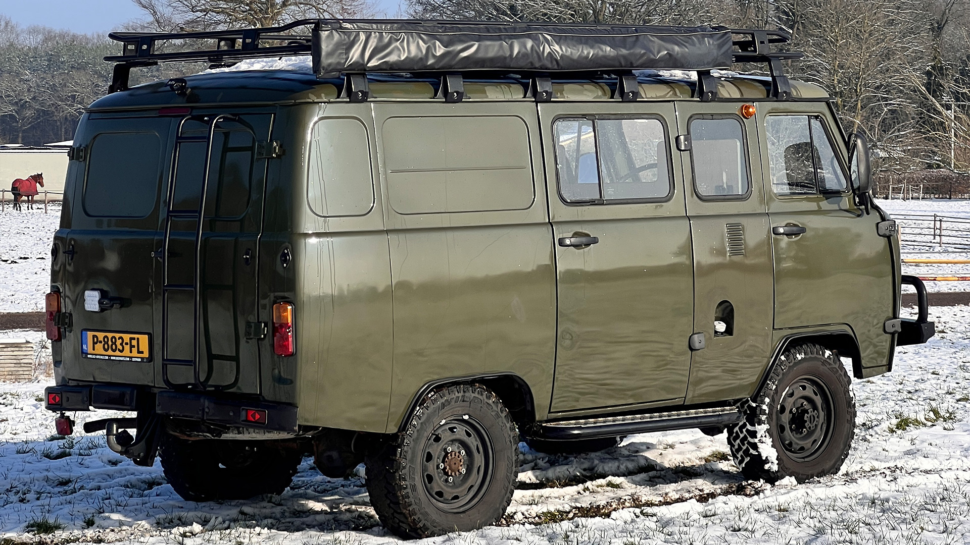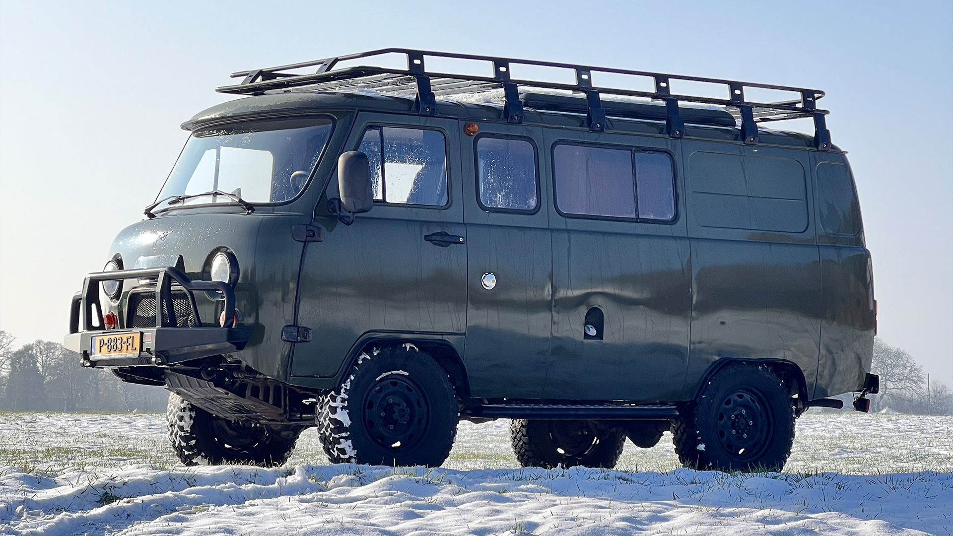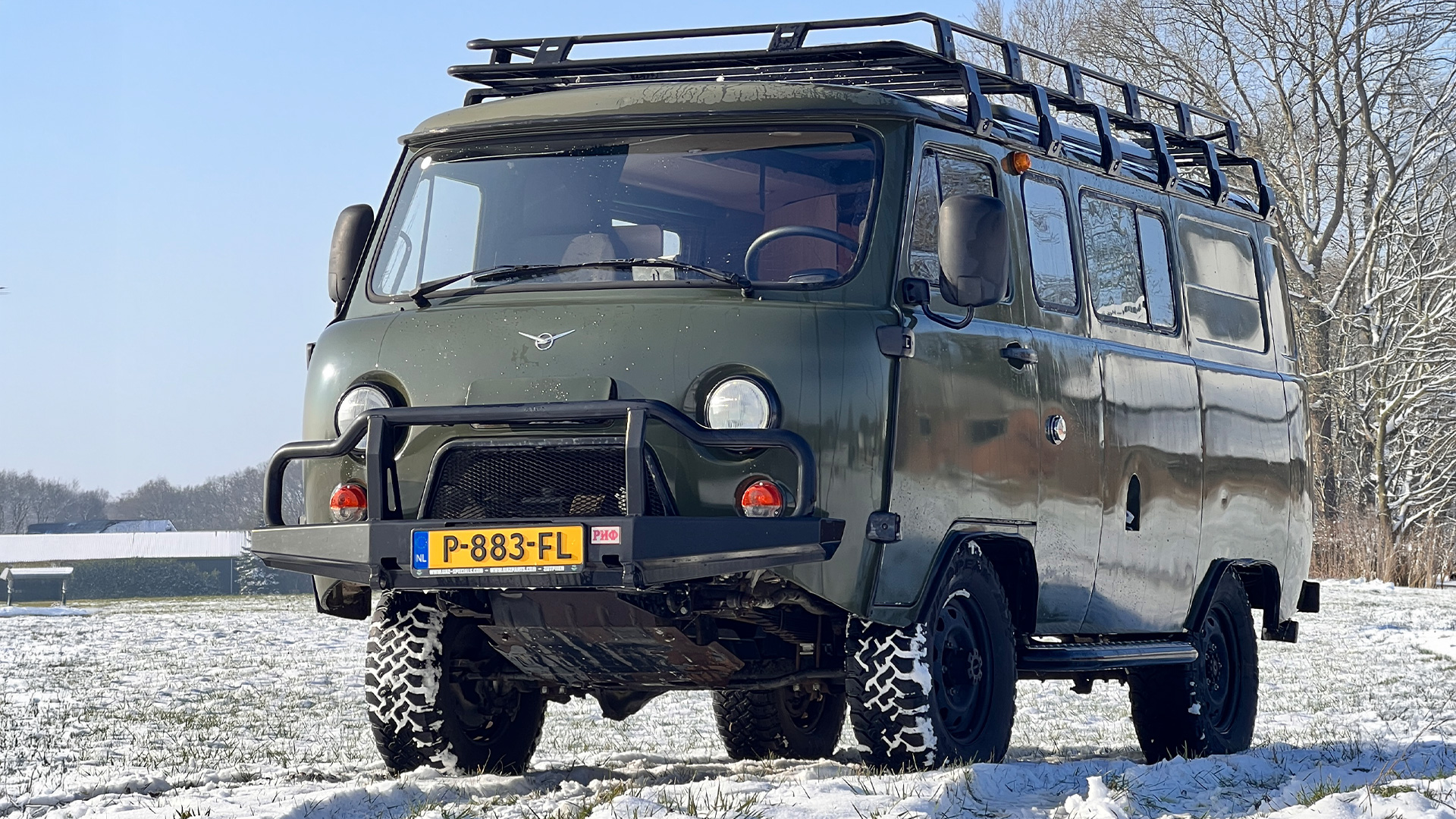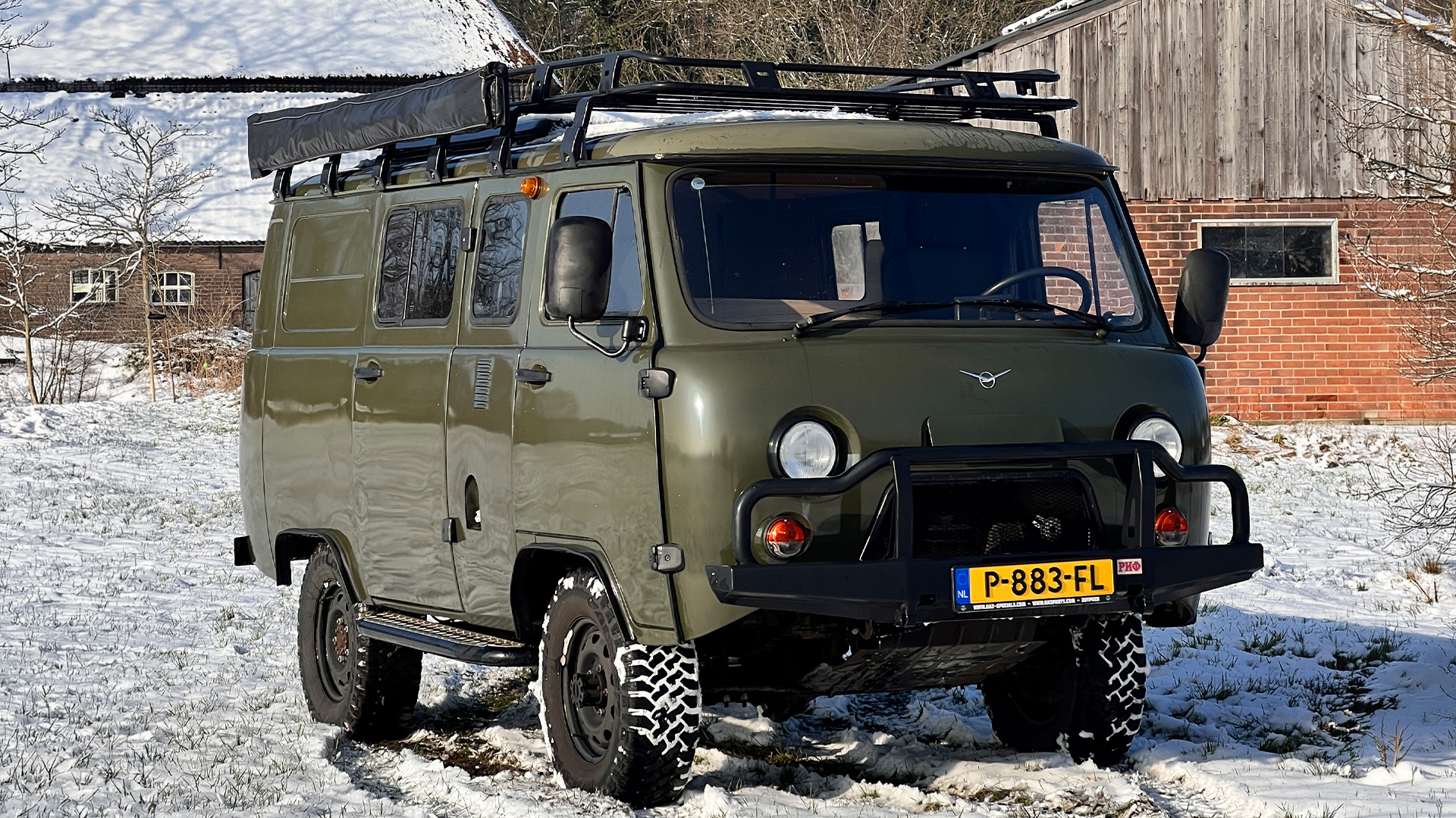 Dit is geen gerestaureerde oldtimer, maar een recent gebouwde UAZ met een klassiek uiterlijk en moderne voorzieningen. Niet snel, wel gemaakt om te blijven rijden. Op asfalt, gravel, zand of modder.