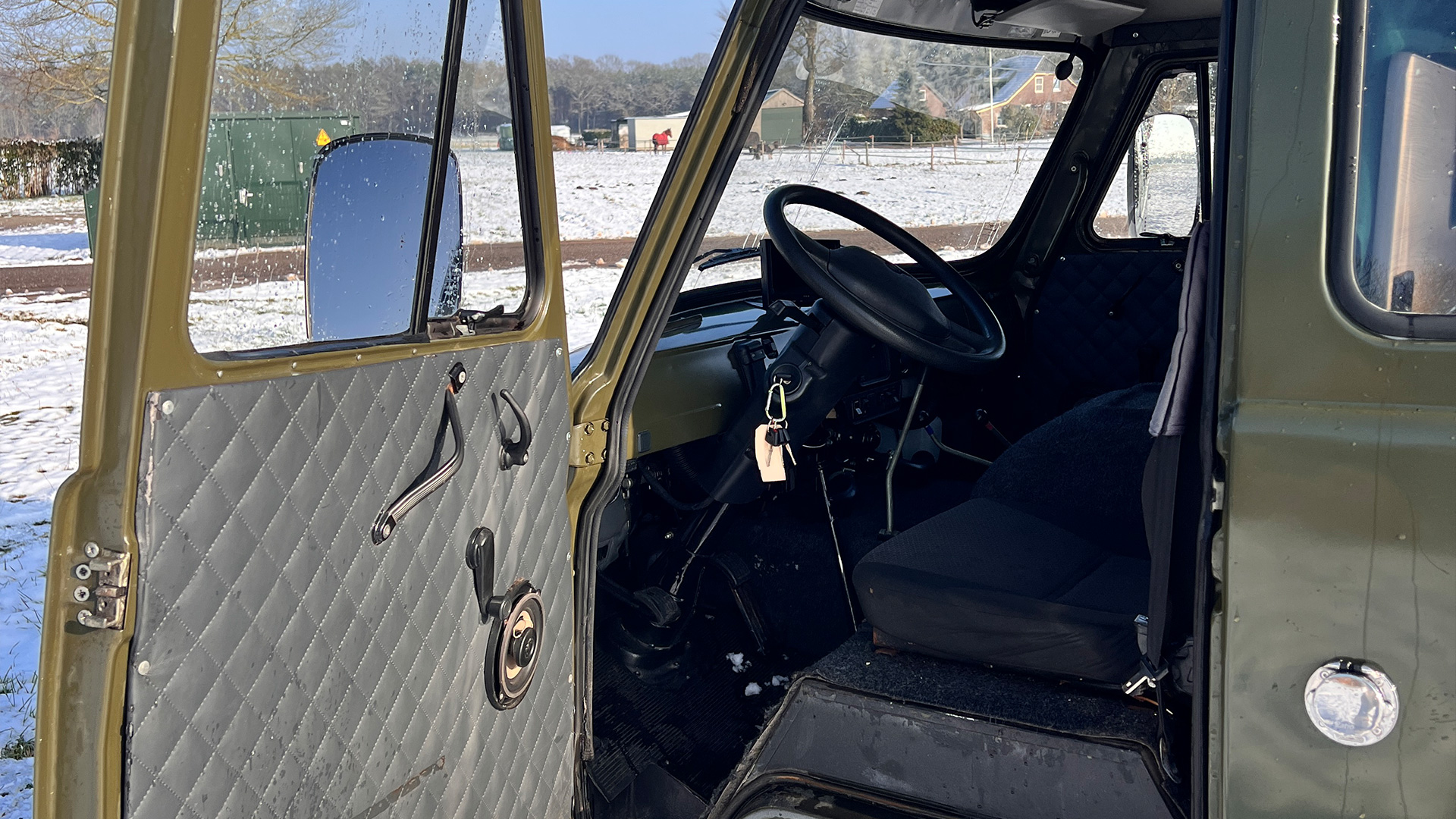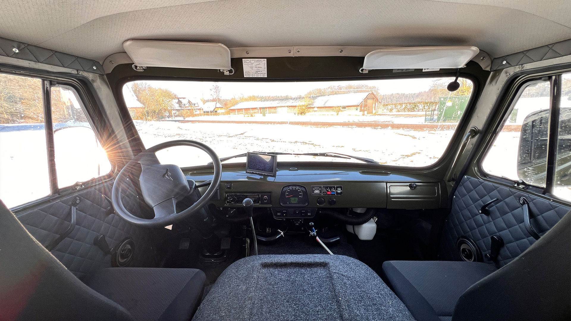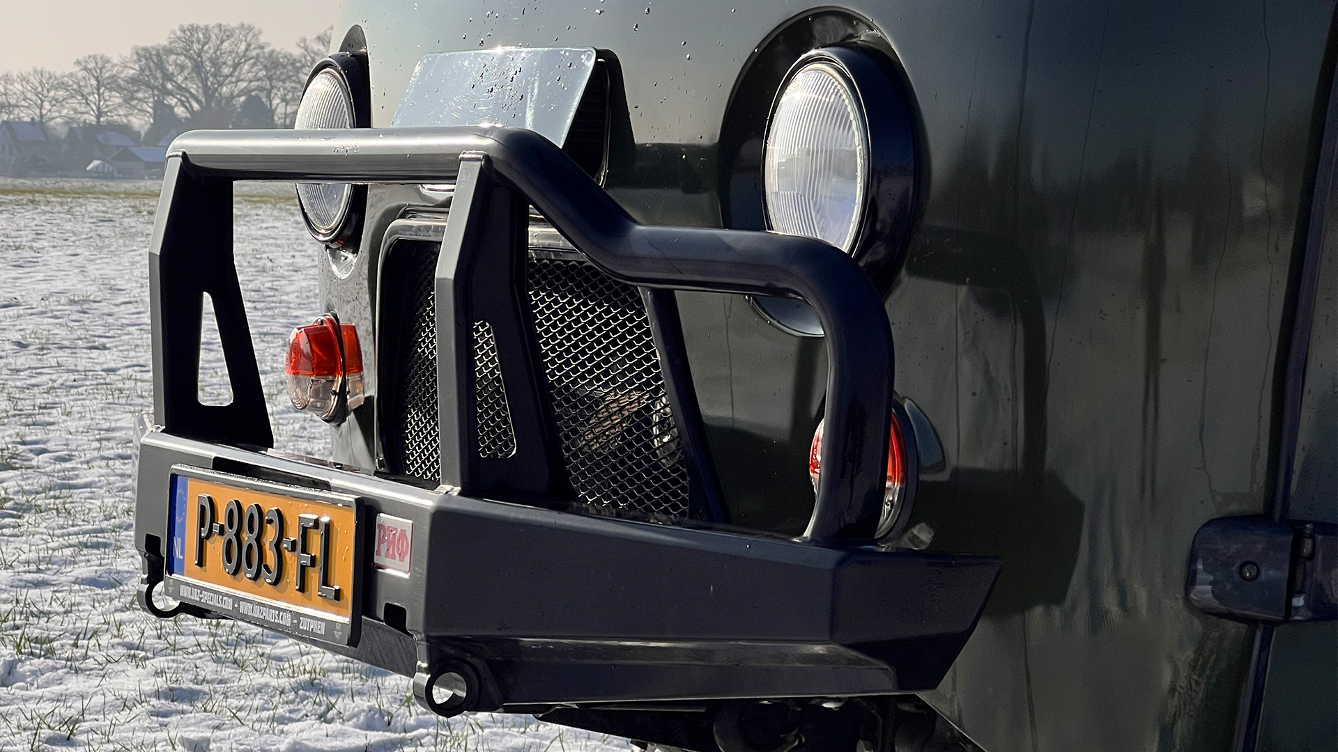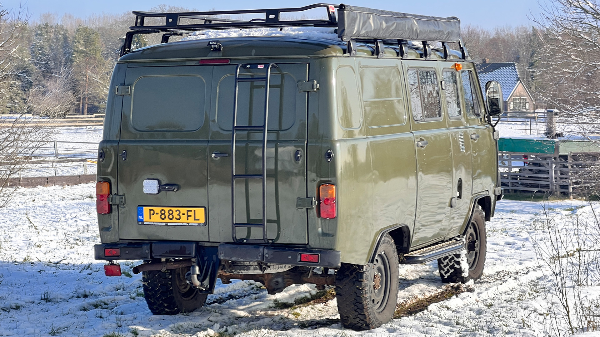 Dit is geen gerestaureerde oldtimer, maar een recent gebouwde UAZ met een klassiek uiterlijk en moderne voorzieningen. Niet snel, wel gemaakt om te blijven rijden. Op asfalt, gravel, zand of modder.